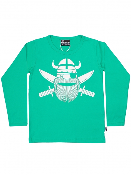 Grünes Basic Langarm Shirt von Danefae aus Dänemark. Der Front Print von Erik dem Wikinger leuchtet im Dunklen - Glow in the Dark Material: 100% Baumwolle Maschinenwäsche bei 30 Grad nicht Trockner geeignet