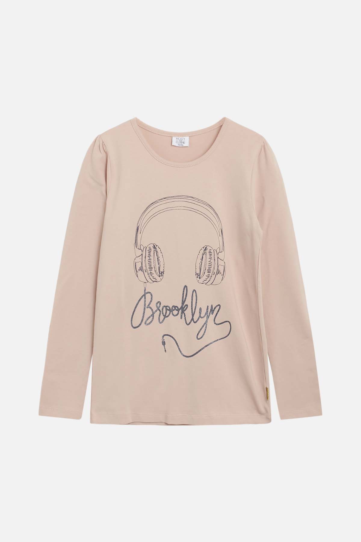 Auf der Vorderseote ist ein Glitzer Print mit Kopfhörern und dem Wort "Brooklyn".